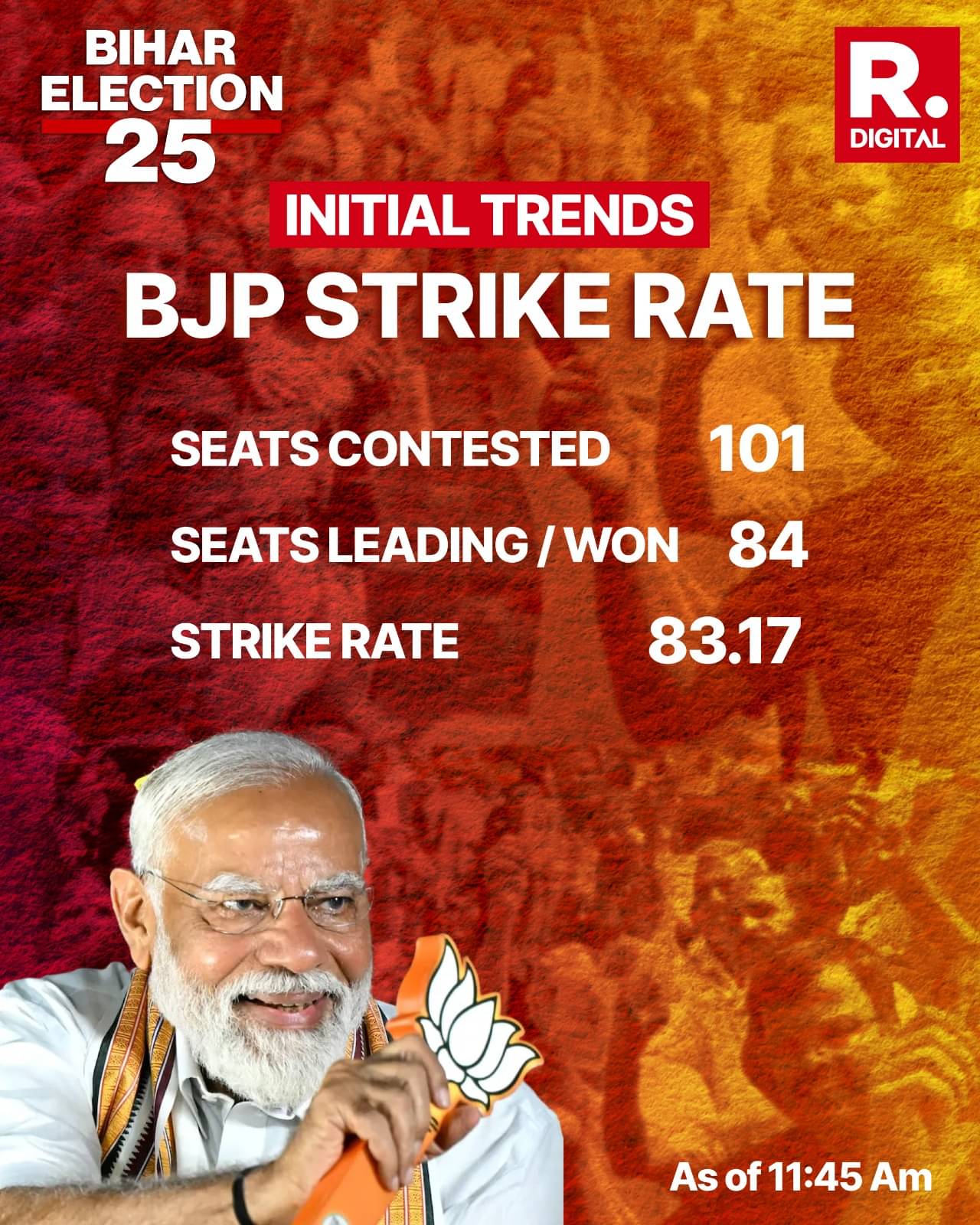 As the counting of votes began for the Bihar Assembly elections on Thursday, early trends show the ruling National Democratic Alliance (NDA) past the halfway mark of 122, strengthening its lead over the Mahagathbandhan. JD(U) has maintained a high conversion rate of more than 68%, with the BJP at a 66% conversion rate. Mahagathbandhan was lagging behind. The RJD holds the highest conversion rate in the alliance of 36%. Meanwhile, Prashant Kishor's Jan Suraaj was leading on two seats.
