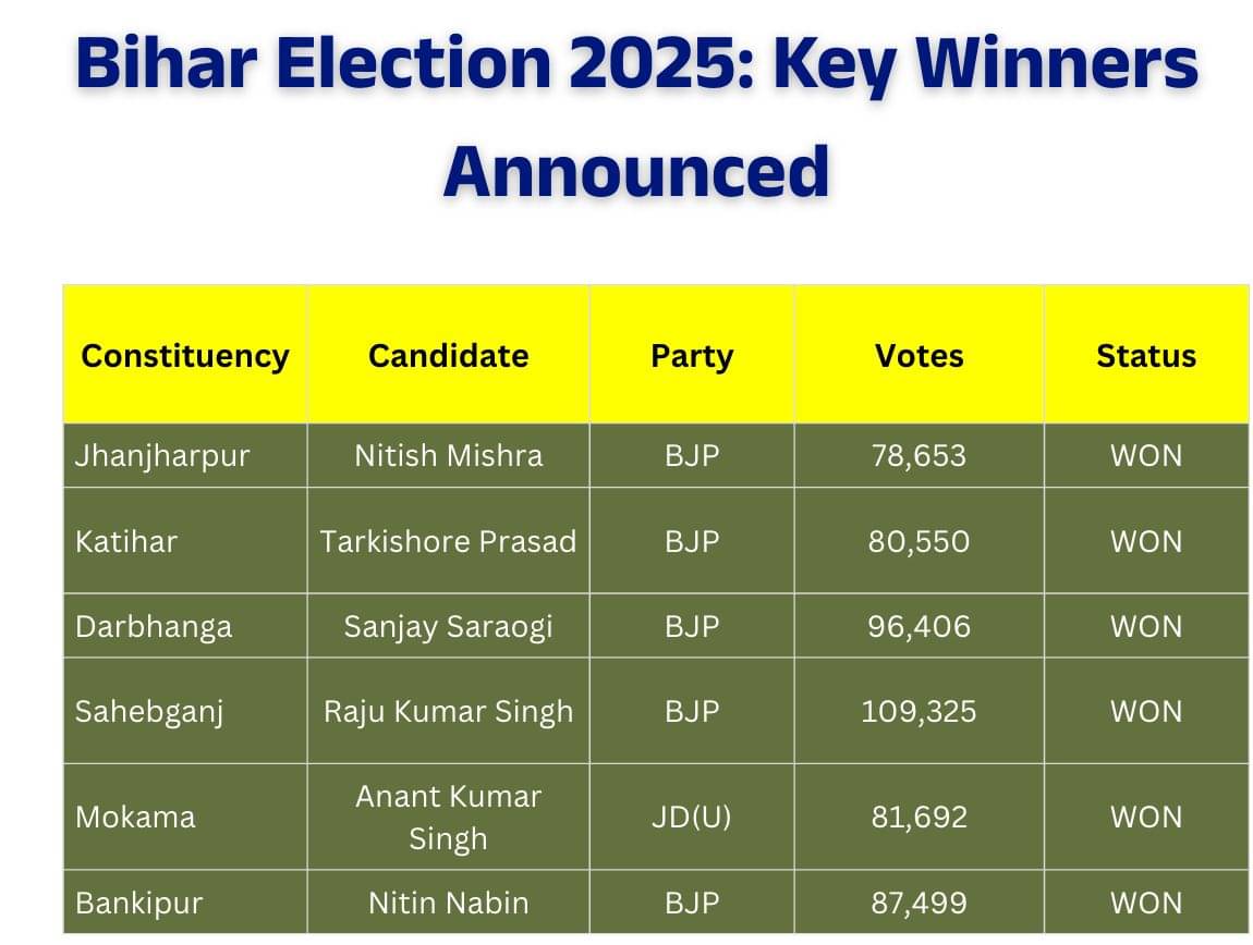 NDA continues its sweeping lead as top BJP and JD(U) candidates secure strong victories across key constituencies. Nitish Mishra (Jhanjharpur), Tarkishore Prasad (Katihar), Sanjay Saraogi (Darbhanga), and Raju Kumar Singh (Sahebganj) won with massive margins. JD(U)’s Anant Kumar Singh clinched Mokama, while BJP’s Nitin Nabin secured Bankipur.
