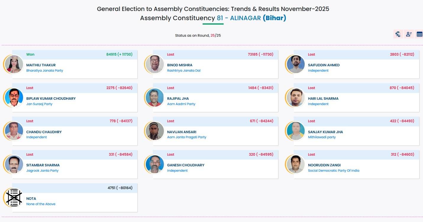Bihar Election 2025 Result LIVE: Singer and BJP candidate Maithili Thakur won from the Alinagar Assembly constituency with a margin of 11730 votes.