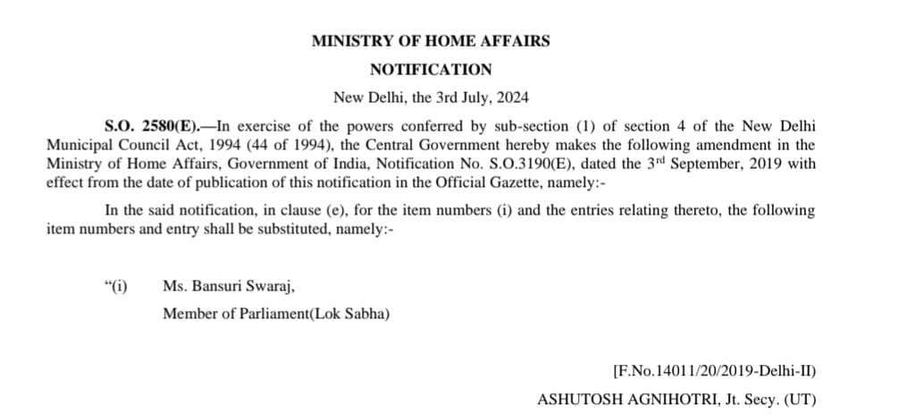 Ministry of Home Affairs notifies the appointment of Lok Sabha MP Bansuri Swaraj as a member of the New Delhi Municipal Council.