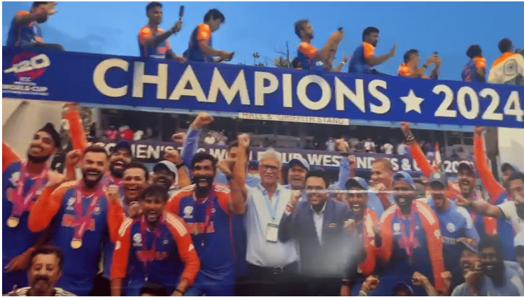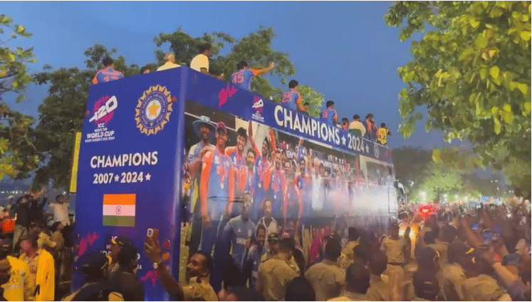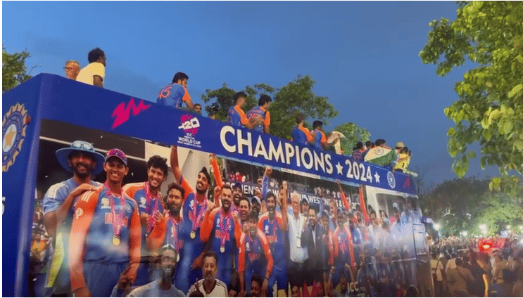 The Men's Indian Cricket Team is en route to ITC Maurya after winning the T20 World Cup 2024 trophy. India defeated South Africa by 7 runs on June 29 in Barbados.