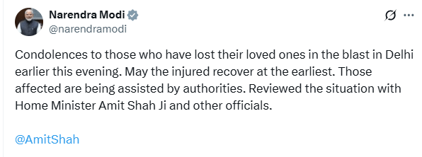 Delhi Red Fort Blast LIVE: Prime Minister Narendra Modi has condoled the deaths of people in the deadly blast that occurred near the Red Fort Metro Station. In a post on X, said, “Condolences to those who have lost their loved ones in the blast in Delhi earlier this evening. May the injured recover at the earliest. Those affected are being assisted by authorities. Reviewed the situation with Home Minister Amit Shah Ji and other officials.”