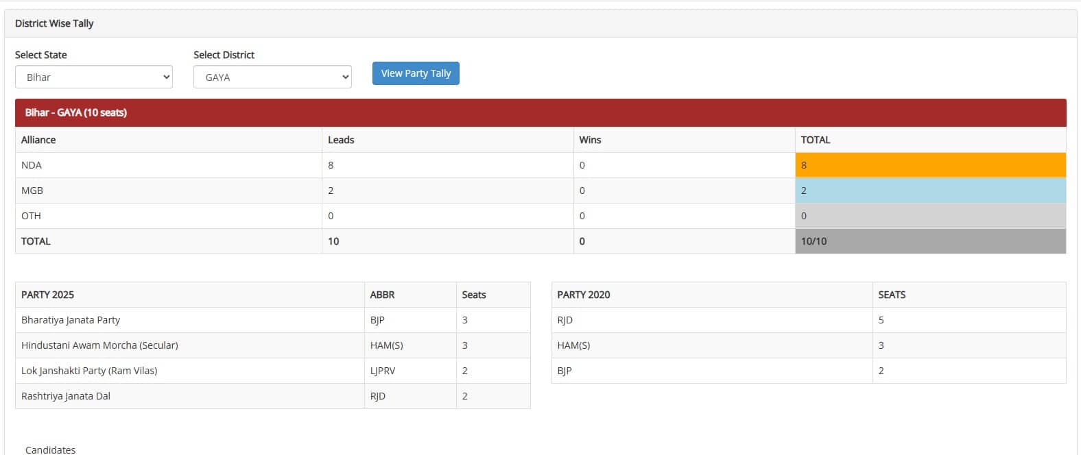 Gaya Election 2025 Result LIVE: Counting trends from Gaya district show the Bharatiya Janata Party (BJP) holding strong leads in key constituencies, while the Indian National Congress trails behind.
