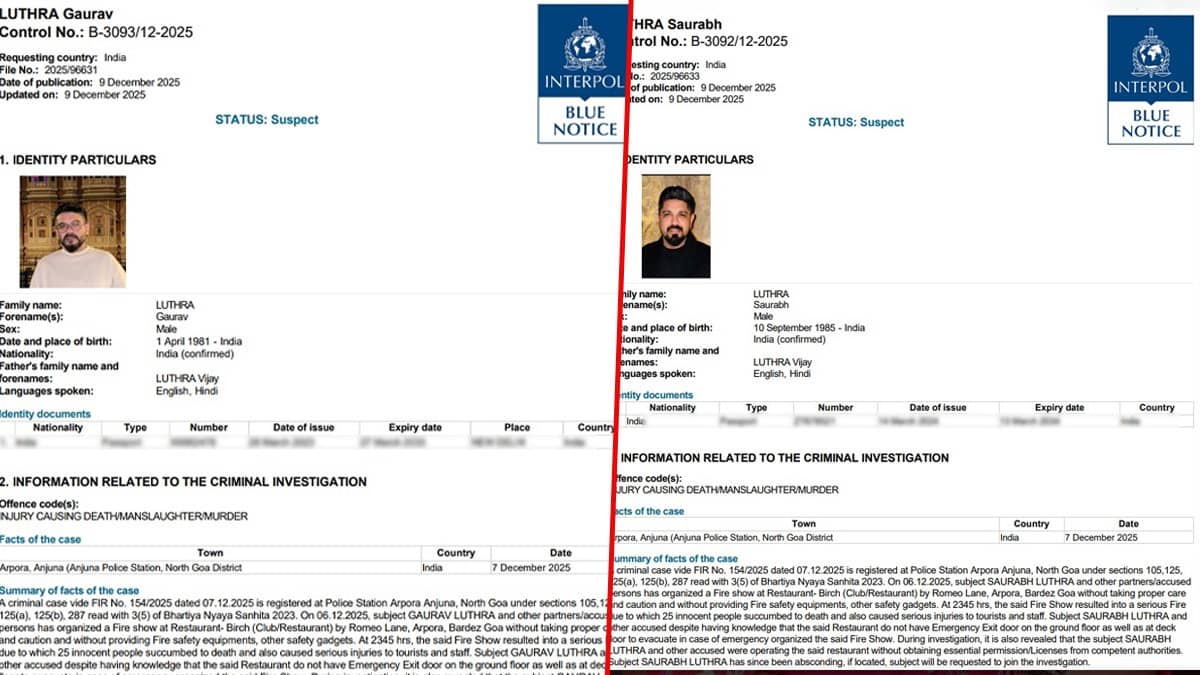 Goa Nightclub Fire Live Update: Republic exclusively accessed fresh details from the Interpol Blue Corner Notices issued against Saurabh and Gaurav Luthra in connection with the Goa nightclub fire that killed 25 people. The notices confirm that both brothers are being sought for offences including injury causing death, manslaughter and murder, as cited in FIR 154/2025 registered at Anjuna Police Station.