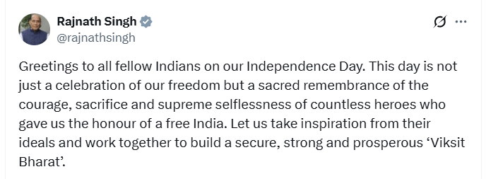 Union Defence Minister Rajnath Singh greeted fellow Indians on the occasion of Independence Day 2025. His message highlighted the emphasis of the Modi government on Viksit Bharat. "Greetings to all fellow Indians on our Independence Day. This day is not just a celebration of our freedom but a sacred remembrance of the courage, sacrifice and supreme selflessness of countless heroes who gave us the honour of a free India. Let us take inspiration from their ideals and work together to build a secure, strong and prosperous ‘Viksit Bharat’," read Singh's post on X.