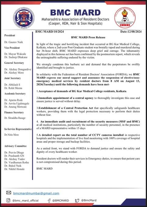 Rape-murder of a PG trainee woman doctor at RG Kar Medical College and Hospital in Kolkata | BMC MARD (Maharashtra Association of Resident Doctors) announces the suspension of elective/non-emergency medical services by resident doctors from 8 am on August 13 until the acceptance of demands of Kolkata's RG Kar Medical College residents, immediate appointment of a central agency to investigate the case, establishment of a Central Protection Act, an immediate audit and recruitment of the security measures at all medial institutions and that of a detailed report on the total number of CCTV cameras installed in respective hospitals are met.