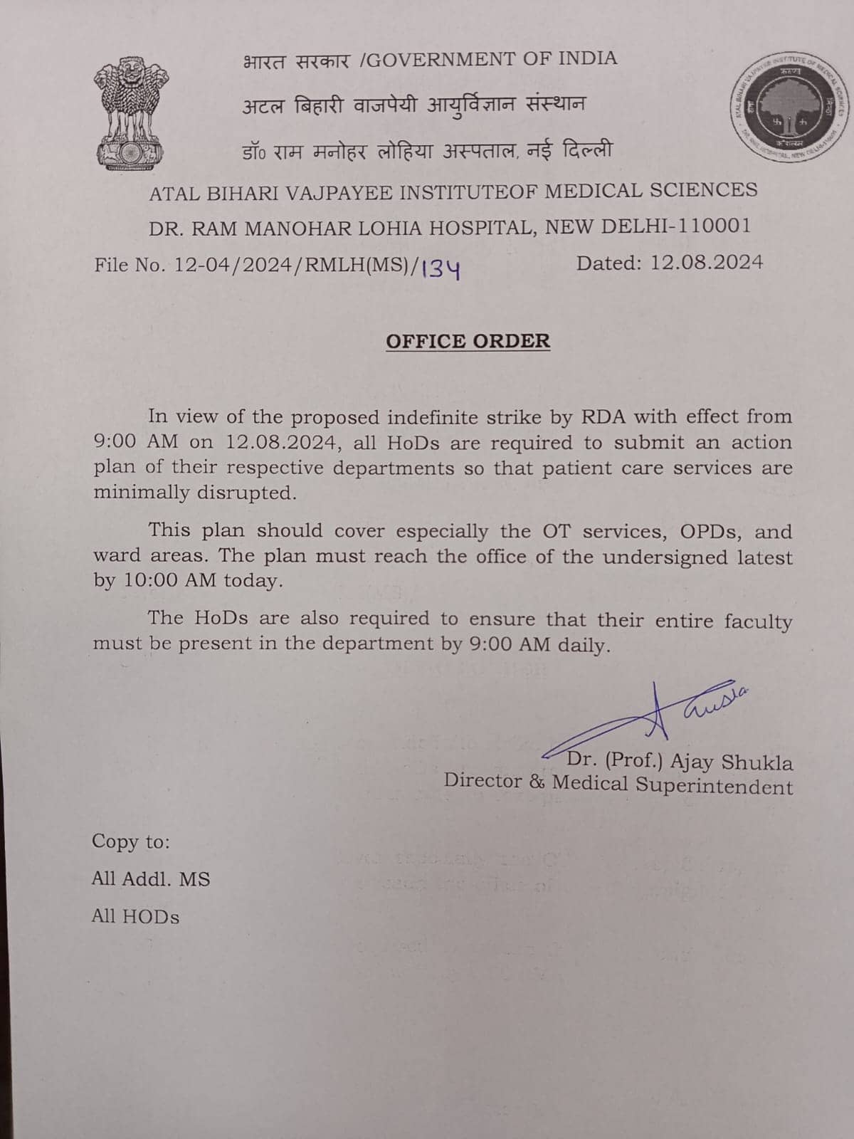 Due to the resident doctors' strike, RML Hospital has canceled all faculty leave and implemented a treatment plan
