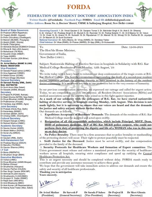 The Federation of Resident Doctors Association (FORDA) on Sunday in a letter to Union Minister JP Nadda announced a nationwide halt of elective services in hospitals from Monday, August 12 following the murder of the trainee doctor in Kolkata.