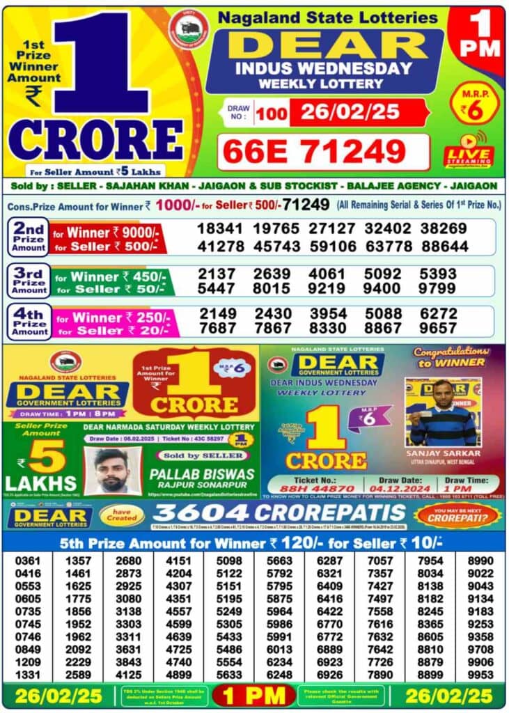Nagaland State Lottery Results - Wednesday, 26 Feb 2025: Check Winners for DEAR INDUS MORNING, DEAR CUPID DAY, and DEAR PELICAN EVENING, Nagaland Dear 1 PM Lottery Result 26-02-2025 (OUT): Live updates for Wednesday's Nagaland Sambad State Lottery results. DEAR Morning1 PM, DEAR Evening 6 PM, DEAR Nagaland Lottery 8 PM lottery winners declared today. First Prize: ₹1 Crore. Check the complete winners list now!