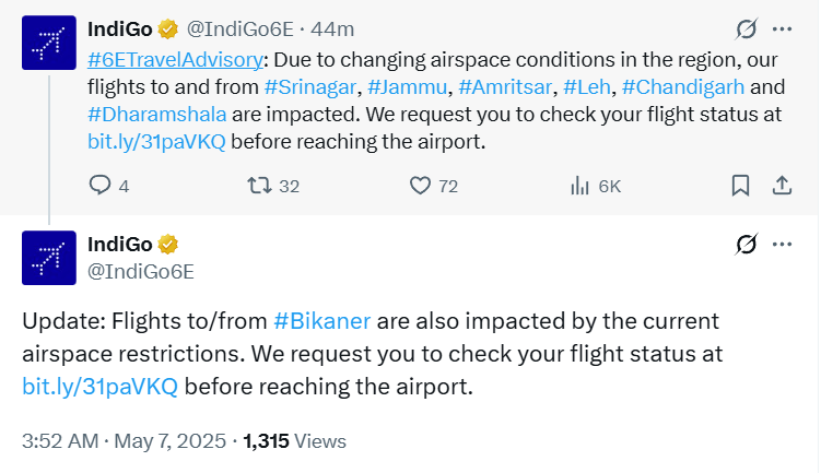 Operation Sindoor Live Updates: Due to changing airspace conditions in the region, our flights to and from Srinagar, Jammu, Amritsar, Leh, Chandigarh and Dharamshala are impacted. Flights to/from Bikaner are also impacted by the current airspace restrictions, says Indigo.
