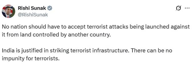 "No nation should have to accept terrorist attacks being launched against it from a land controlled by another country. India is justified in striking terrorist infrastructure. There can be no impunity for terrorists." Rishi Sunak posted on X.