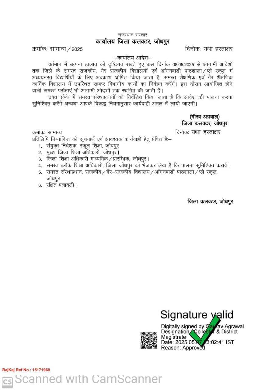 District Collector Gaurav Agarwal said, “In view of the current situation, Jodhpur administration announces a holiday in all private and government schools and Anganwadis from today till further orders.” The order will remain in effect until further instructions are issued.