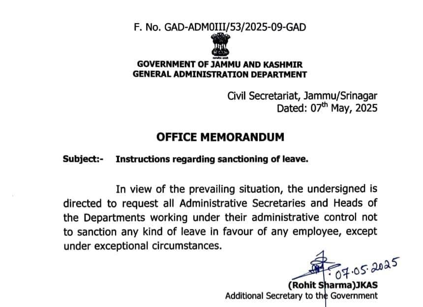 Operation Sindoor LIVE Updates: Amid growing tensions across India-Pakistan border following Operation Sindoor on May 7, the Jammu and Kashmir government has cancelled all types of leaves for the government employees. The department heads have been instructed not to approve any leave requests.