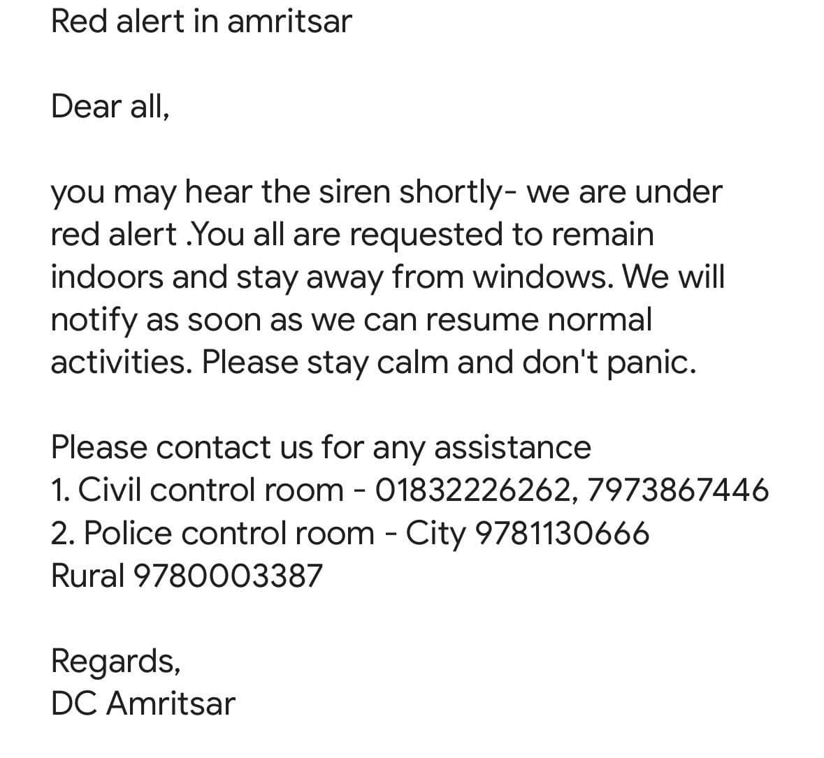 At around 5 AM, an advisory was issued for the people of Amritsar asking them to stay indoors and away from the windows and keep lights turned off and window curtain drawn. ‘There is no need to panic, a siren will blow now and we will pass the message again once it is clear,” the advisory read.