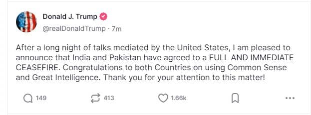 Trump Says India, Pakistan Agree to ‘Full and Immediate Ceasefire’