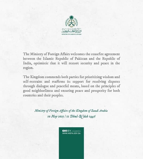 Saudi Arabia welcomes the India, Pakistan Ceasefire...