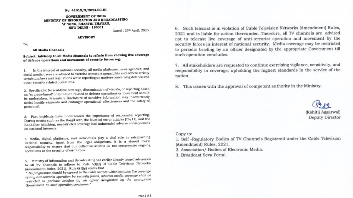 Ministry of Information and Broadcasting issues advisory to all Media channels to refrain from showing live coverage of defence operations and movement of security forces in the interest of national security
