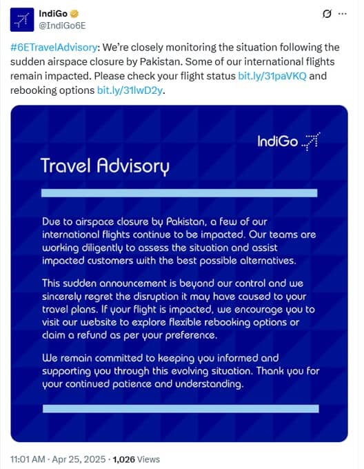IndiGo Airlines Monitors Situation as Pakistan Closes Airspace, Disrupting Flights