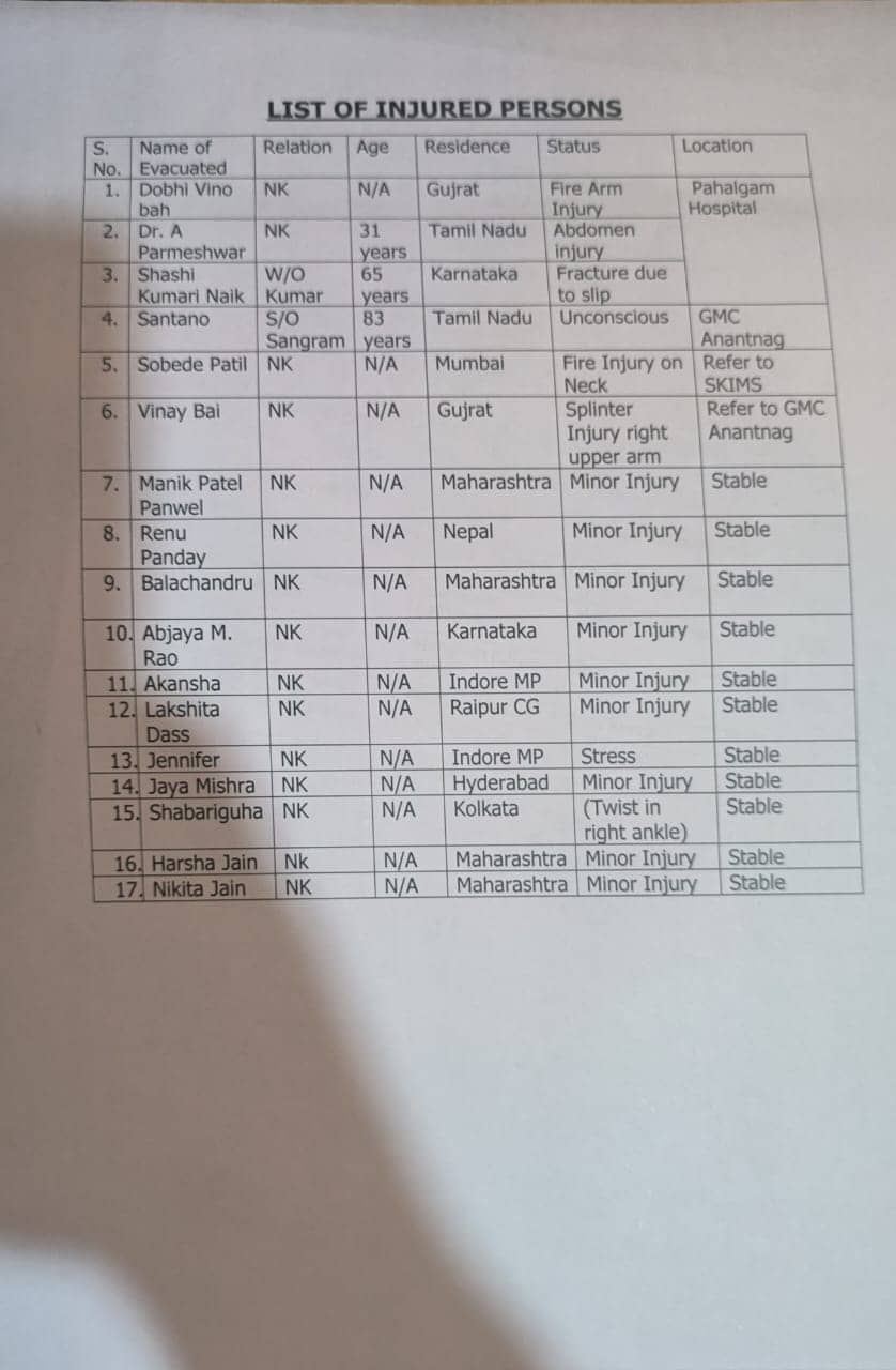 Details of Killed and injured Tourists in Pahalgam terrorist attack