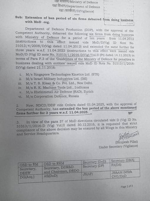 Government of India Extends the Ban on Six Defence Firms for Three More Years.