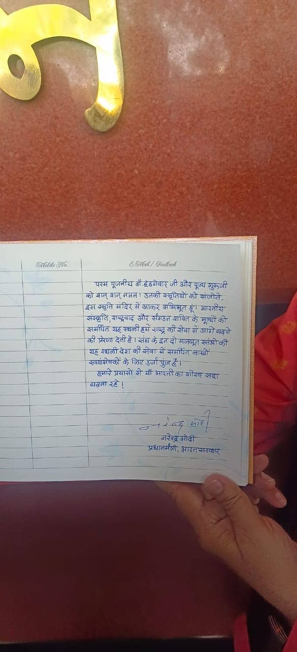Prime Minister Narendra Modi signed the visitor’s book after paying tribute to RSS founder Keshav Baliram Hedgewar at Smruti Mandir in Nagpur.