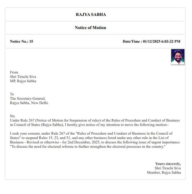 DMK MP Tiruchi Siva has given a Suspension of Business Notice in Rajya Sabha under Rule 267 and demanded to discuss the need for electoral reforms to further strengthen the electoral processes in the country