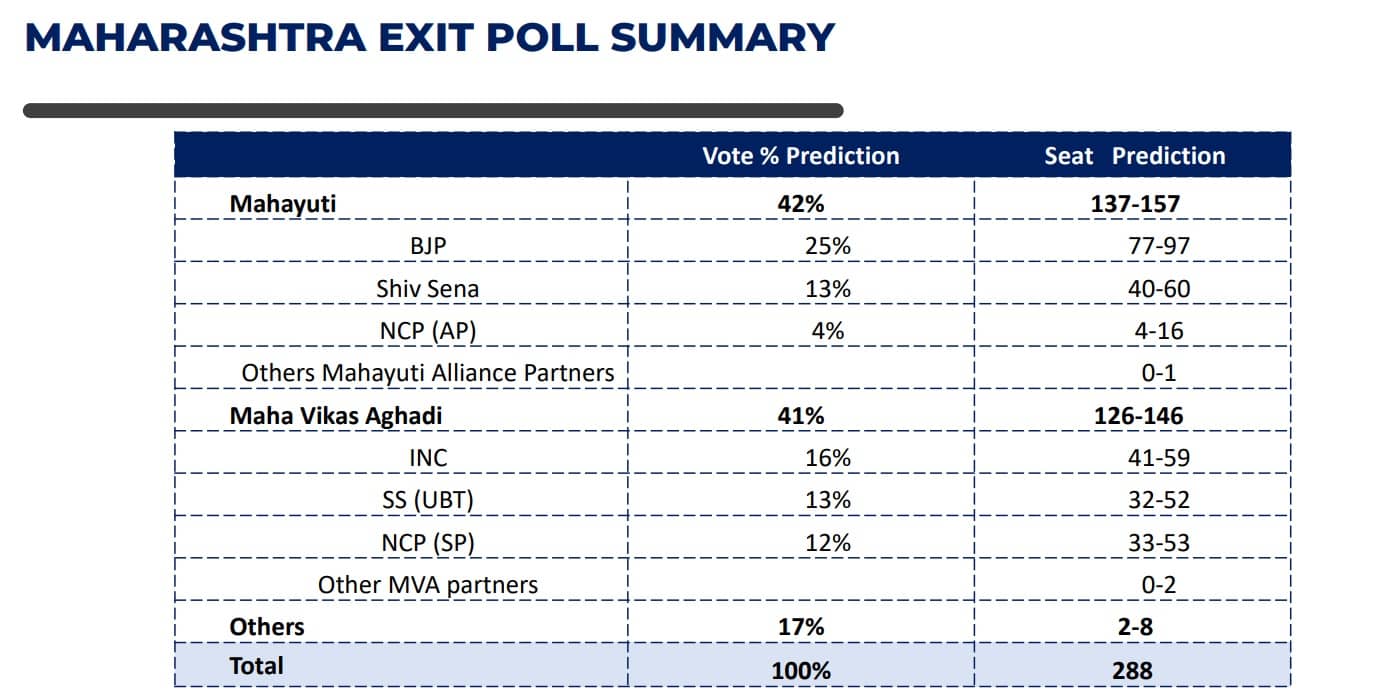 According to the Matrize exit poll predictions for Maharashtra, the Mahayuti may get 150-170 seats, MVA might bag 110-130 seats while 8-10 seats may be won by other candidates.