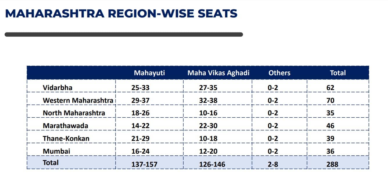 - The Mahayuti may win P-MARQ 137-157 seats, MVA may get 126-146 while others might bag somewhere between 2-8 seats.