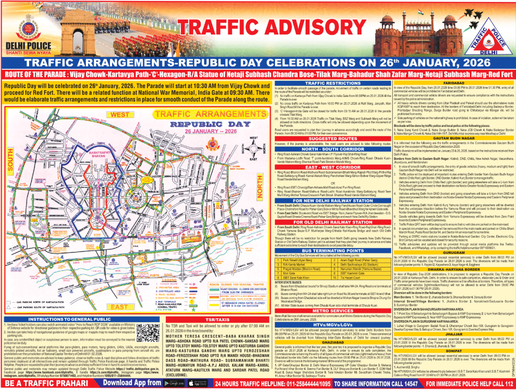 - No traffic on Kartavya Path from Vijay Chowk to India Gate from 6 pm on 25 January till the Republic Day Parade is over.