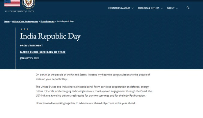 Republic Day 2026: Marco Rubio Extends Republic Day Greetings To India