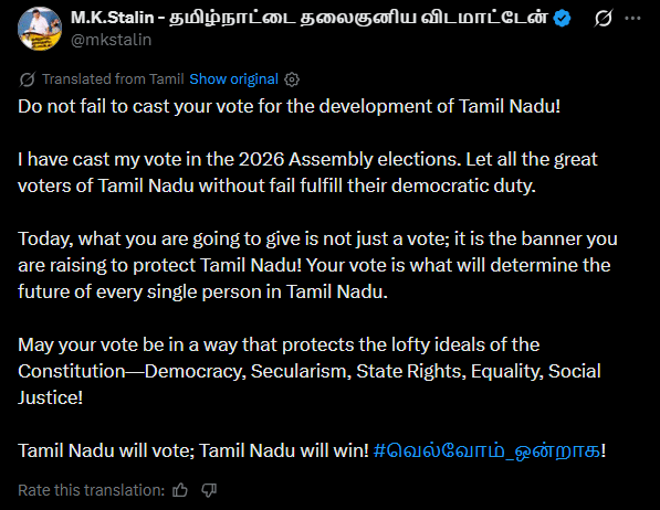 Tamil Nadu Election 2026 LIVE: Bharatiya Janata Party (BJP) leader and former state president K Annamalai on Thursday cast his vote at a polling station located in PSG College of Arts and Science in Coimbatore as polling for the Tamil Nadu Assembly elections is underway.