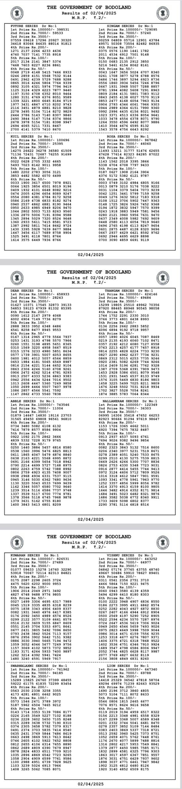 Bodoland Lottery Sambad Today Result 01-04-2025 WEDNESDAY result:
