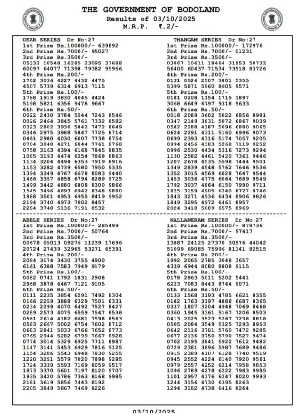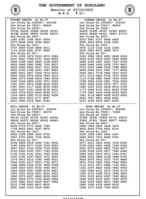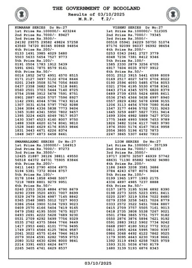 The Bodoland Lottery Result for 03.10.2025 is set to be announced today at 12 PM, 3 PM and 7 PM IST. Participants eagerly await the results of the Assam State Lottery. The Bodoland Lottery is a popular lottery organised by the Government of Assam, drawing a large number of participants daily. Scroll down to check the Bodoland lottery FRIDAY results now.
