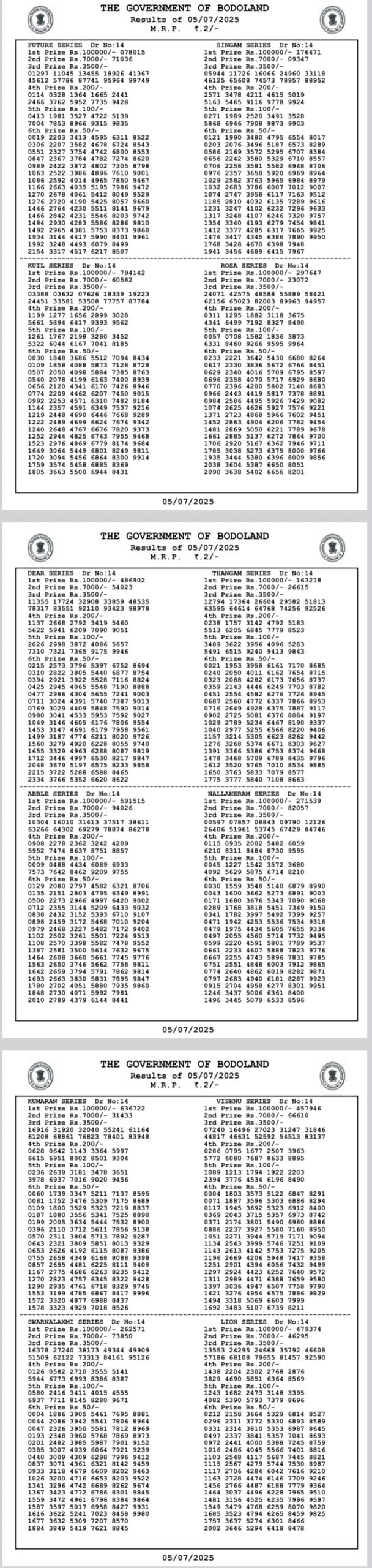 Bodoland Lottery Sambad Today Result 05.07.2025 SATURDAY 12 PM, 3 PM and 7 PM