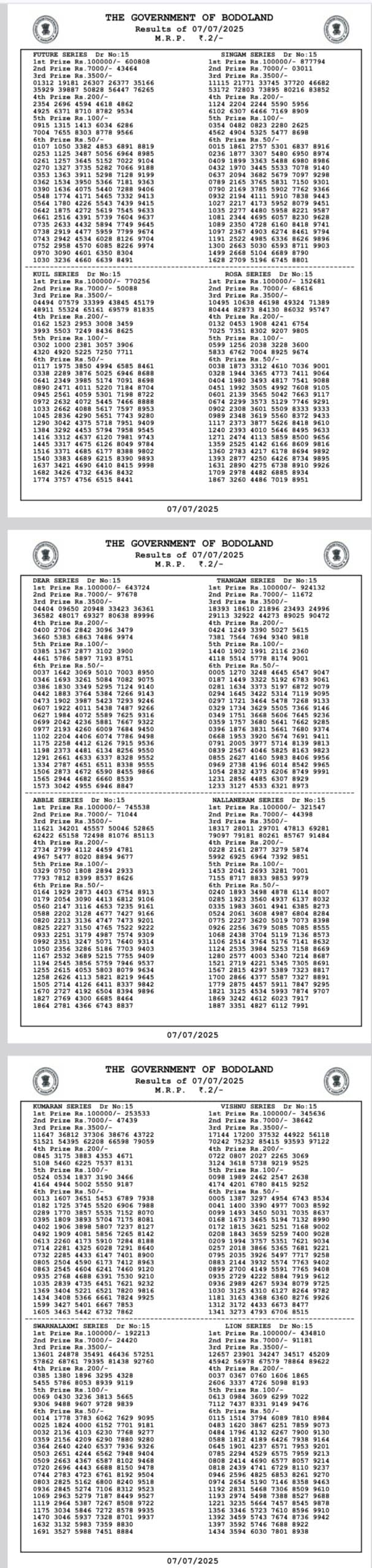 Bodoland Lottery Sambad Today Result 07.07.2025 MONDAY 12 PM, 3 PM and 7 PM