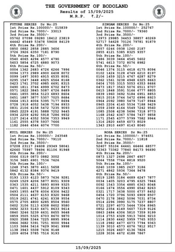 Bodoland Lottery Sambad Today Result 15.09.2025 MONDAY 12 PM, 3 PM and 7 PM