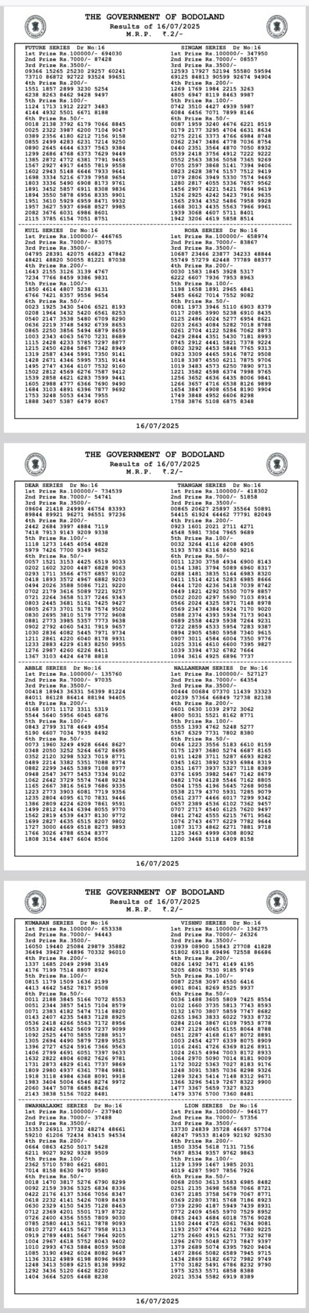 Bodoland Lottery Sambad Today Result 16.07.2025 WEDNESDAY 12 PM, 3 PM and 7 PM