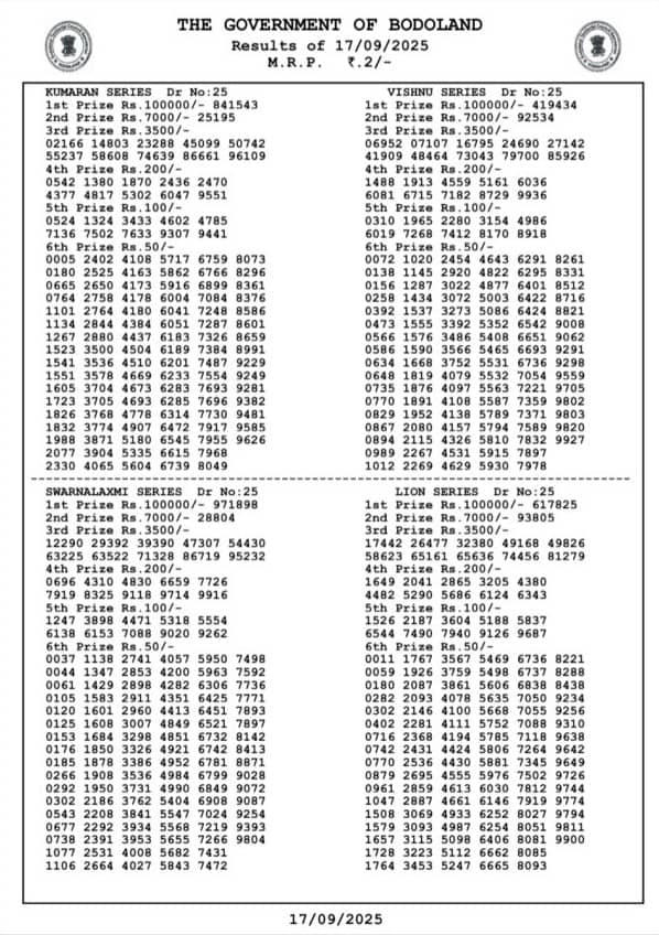 Bodoland Lottery Sambad Today Result 17.09.2025 WEDNESDAY result: Bodoland lottery results out check here now…