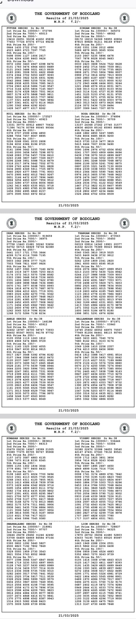 Bodoland Lottery Sambad Today Result 21-03-2025 Monday result: