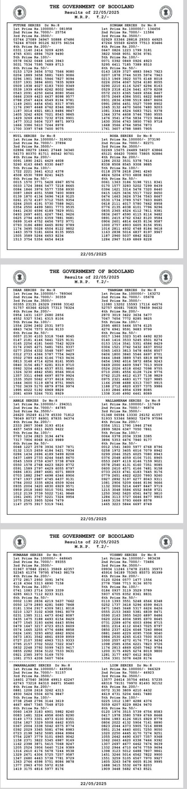 Bodoland Lottery Sambad Today Result 22-05-2025 Saturday 12 PM, 3 PM and 7 PM
