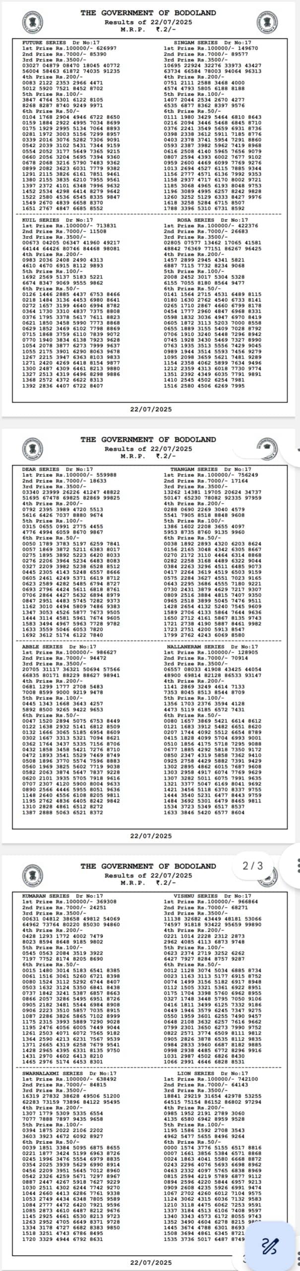 Bodoland Lottery Sambad Today Result 22/07/2025 TUESDAY 12 PM, 3 PM and 7 PM
