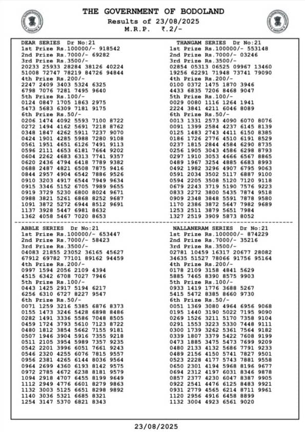 The Bodoland Lottery Result for 23.08.2025 is set to be announced today at 12 PM, 3 PM and 7 PM IST. Participants eagerly await the results of the Assam State Lottery. The Bodoland Lottery is a popular lottery organised by the Government of Assam, drawing a large number of participants daily. Scroll down to check the Bodoland lottery SATURDAY results now.