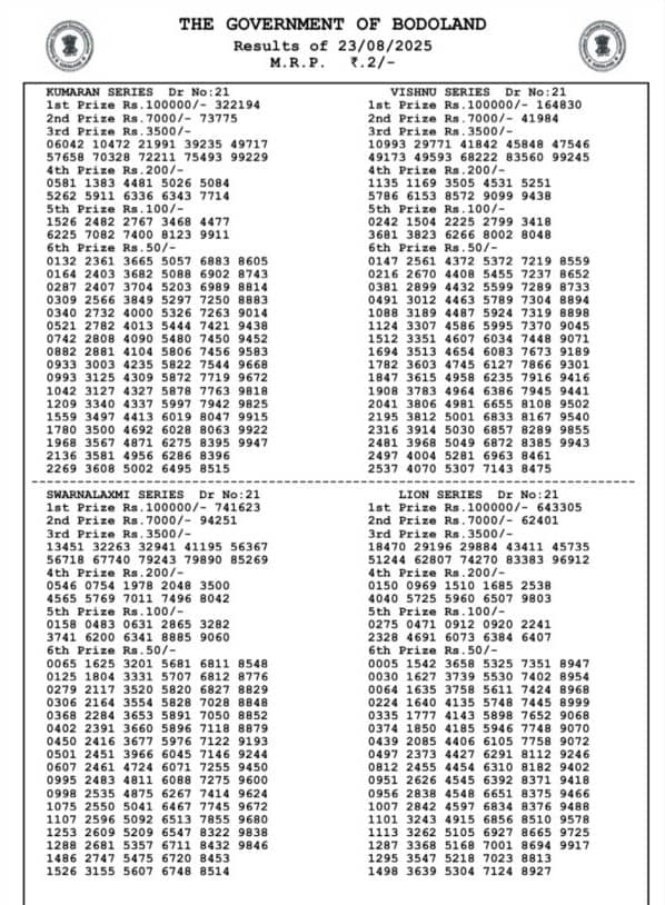 Bodoland Lottery Sambad Today Result 23.08.2025 SATURDAY result: Bodoland lottery results out check here now…
