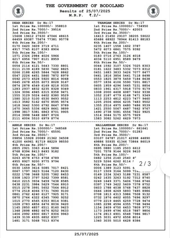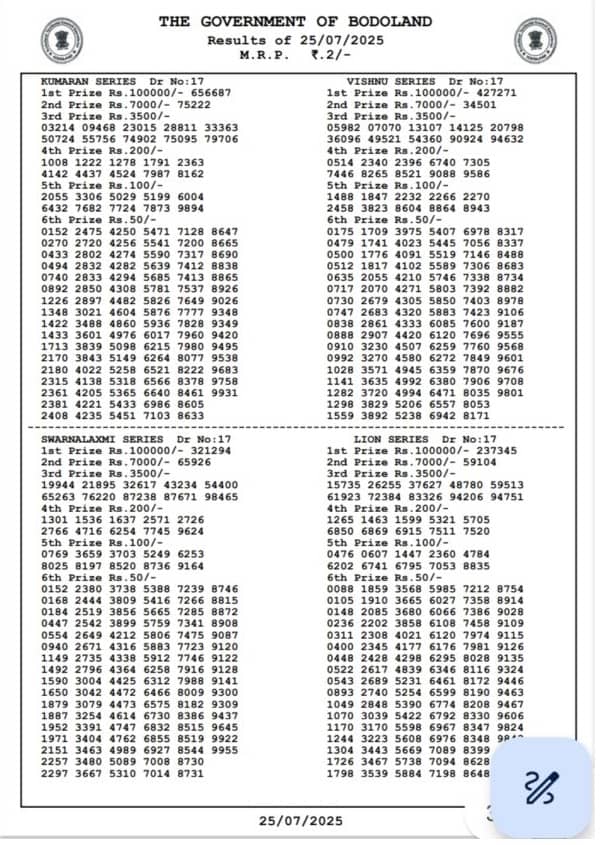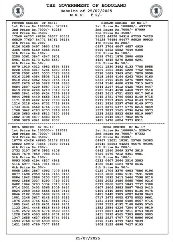 Bodoland Lottery Sambad Today Result 25.07.2025 FRIDAY result: Bodoland lottery results out check here now…