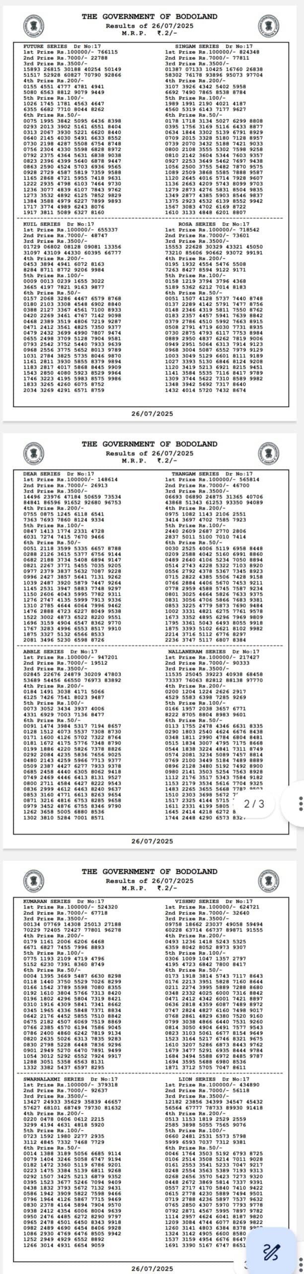 Bodoland Lottery Sambad Today Result 26.07.2025 SATURDAY 12 PM, 3 PM and 7 PM