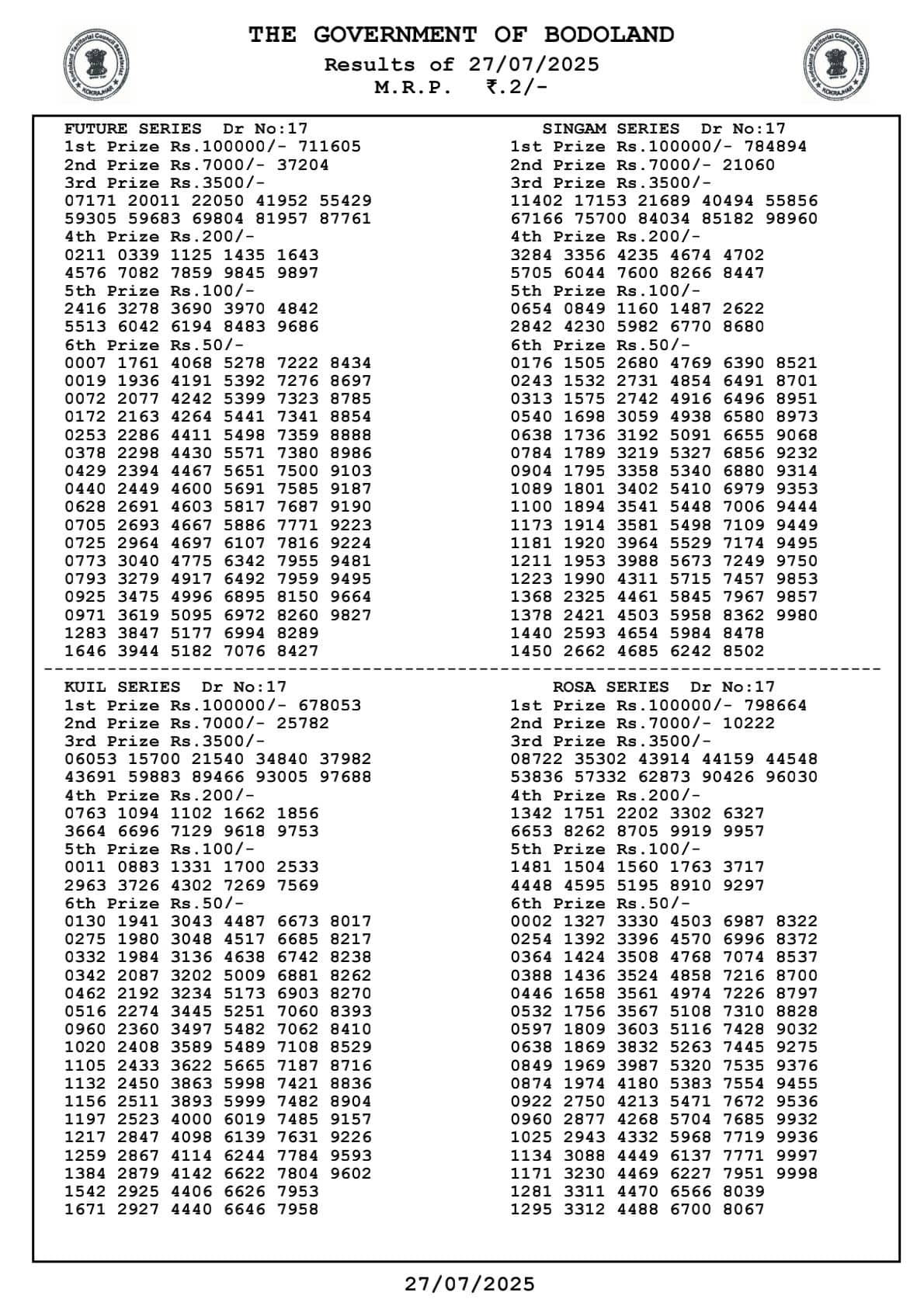 Bodoland Lottery Sambad Today Result 27.07.2025 SUNDAY result: Bodoland lottery result check are here…