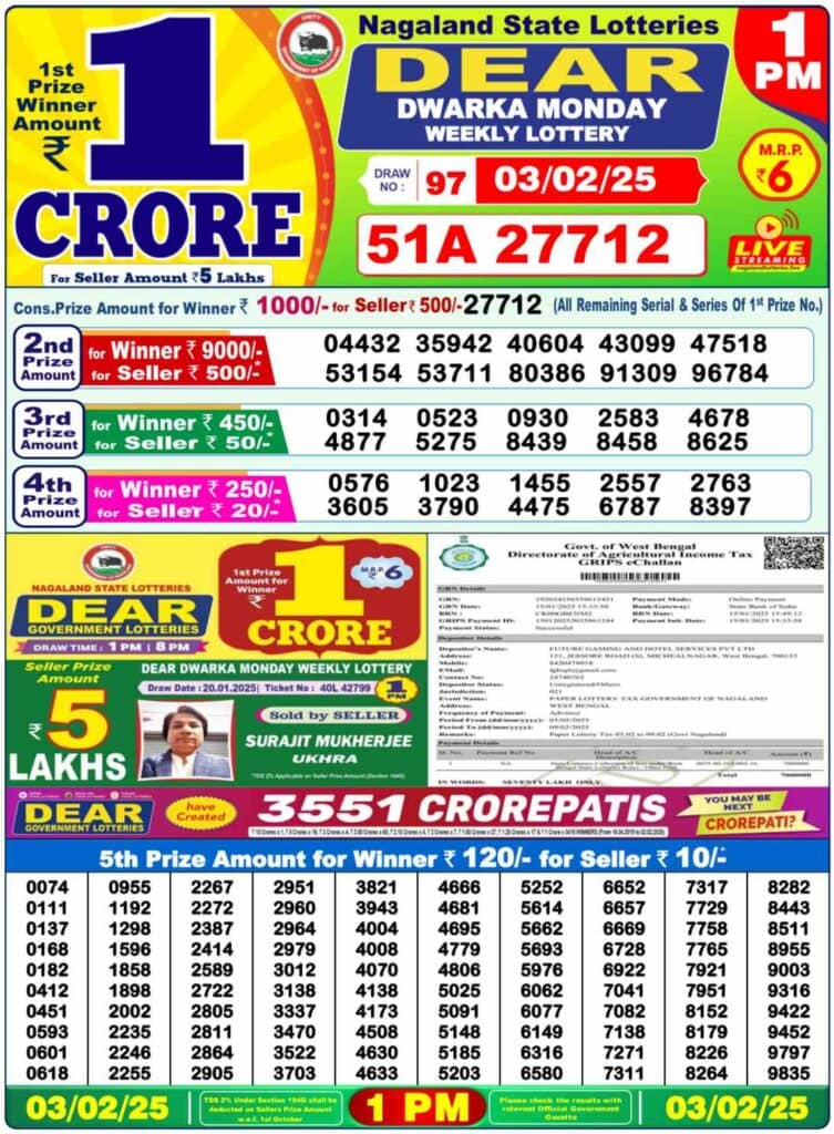 Nagaland DEAR DWARKA Morning 1 PM Result: 1st Prize Ticket No. 51A 27712