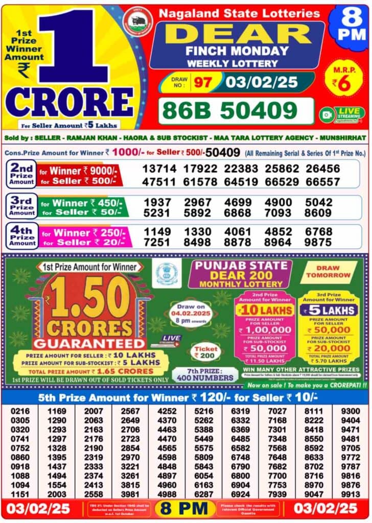 Nagaland State Lottery Monday, 03 February, 2025: The results of Nagaland State Lottery DEAR DWARKA MORNING 1 PM, BLITZEN DAY 6 PM, DEAR FINCH EVENING 8 PM weekly lottery will be declared today i.e. Monday, at 1 PM, 6 PM and 8 PM respectively. To view the list of winners, scroll down.