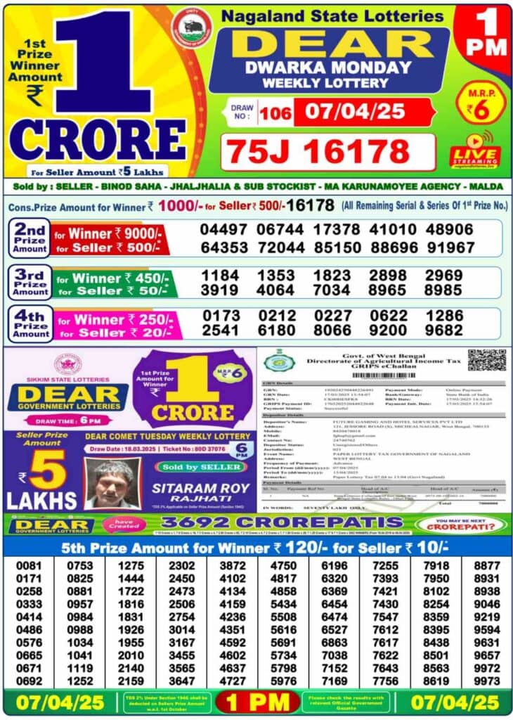 LIVE | Nagaland Lottery (07.04.2025) DEAR DWARKA MONDAY 1 PM OUT- 1st Prize Ticket No. 75J 16178