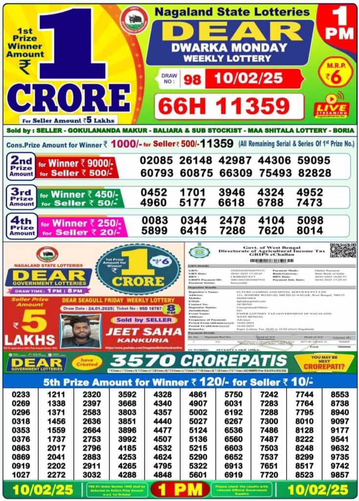 Nagaland State Lottery Monday, 10 February, 2025: The results of Nagaland State Lottery DEAR DWARKA MORNING 1 PM, BLITZEN DAY 6 PM, DEAR FINCH EVENING 8 PM weekly lottery will be declared today i.e. Monday, at 1 PM, 6 PM and 8 PM respectively. To view the list of winners, scroll down.